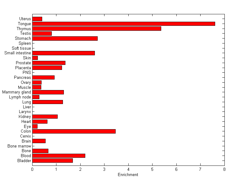 The expression level is normalized with tissue-library size. Each value for a gene in a tissue is a ratio of observed ESTs to the expected one in this tissue. The expected number of ESTs is the product of total ESTs of the gene and the fraction of total ESTs in the tissue among all ESTs in 30 tissues.