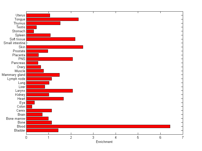 The expression level is normalized with tissue-library size. Each value for a gene in a tissue is a ratio of observed ESTs to the expected one in this tissue. The expected number of ESTs is the product of total ESTs of the gene and the fraction of total ESTs in the tissue among all ESTs in 30 tissues.