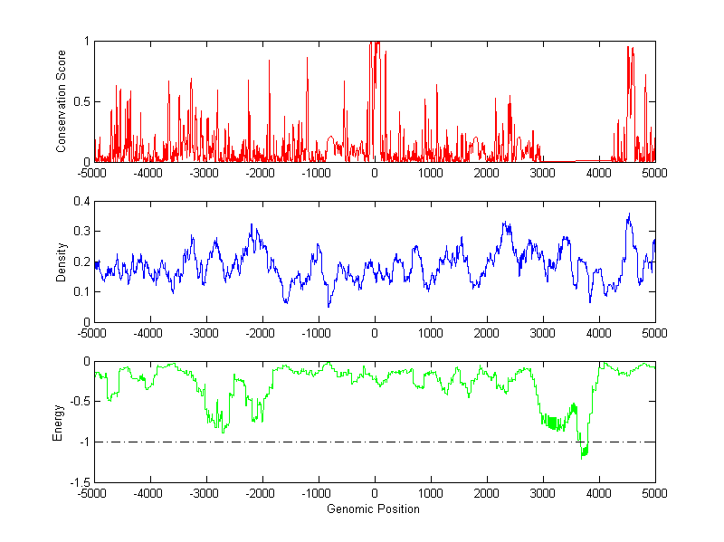 The energy profile (green curve) is about energy for module detection based on TF interaction. The positions with energy less than -1 indicate the existence of CRMs.
