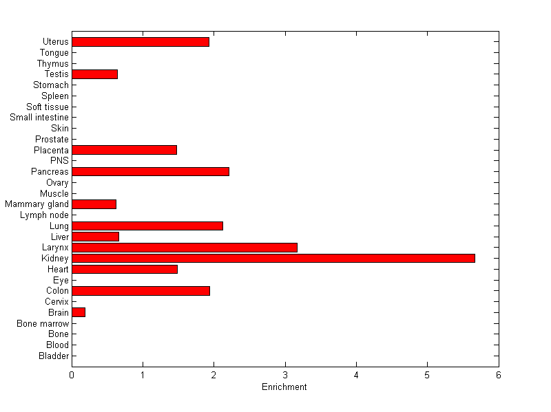 The expression level is normalized with tissue-library size. Each value for a gene in a tissue is a ratio of observed ESTs to the expected one in this tissue. The expected number of ESTs is the product of total ESTs of the gene and the fraction of total ESTs in the tissue among all ESTs in 30 tissues.