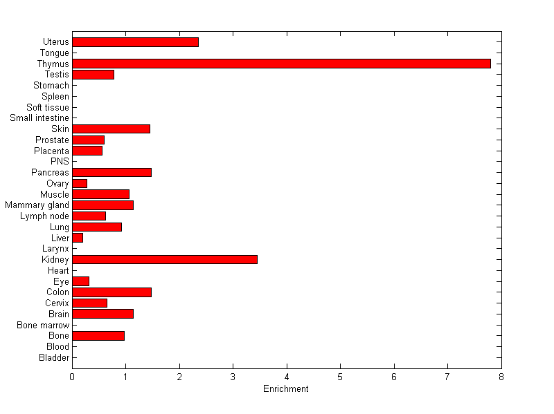 The expression level is normalized with tissue-library size. Each value for a gene in a tissue is a ratio of observed ESTs to the expected one in this tissue. The expected number of ESTs is the product of total ESTs of the gene and the fraction of total ESTs in the tissue among all ESTs in 30 tissues.