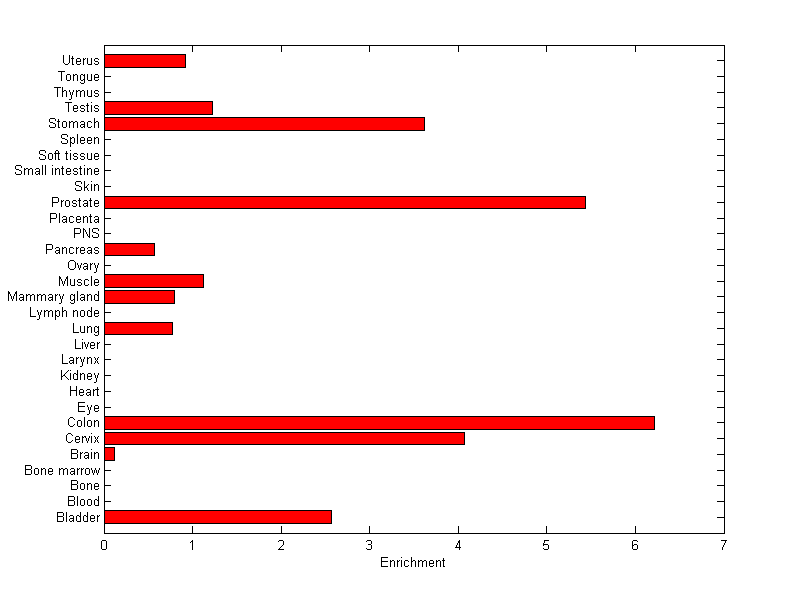 About the profile: The expression level is normalized with tissue-library size. Each value for a gene in a tissue is a ratio of observed ESTs to the expected one in this tissue. The expected number of ESTs is the product of total ESTs of the gene and the fraction of total ESTs in the tissue among all ESTs in 30 tissues. Summary: This gene is preferentially expressed in [colon, prostate] Download: |
