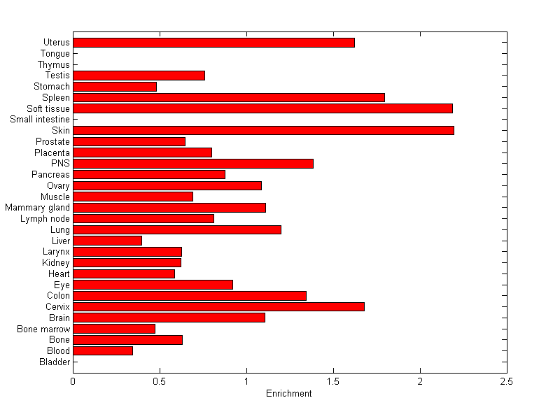The expression level is normalized with tissue-library size. Each value for a gene in a tissue is a ratio of observed ESTs to the expected one in this tissue. The expected number of ESTs is the product of total ESTs of the gene and the fraction of total ESTs in the tissue among all ESTs in 30 tissues.