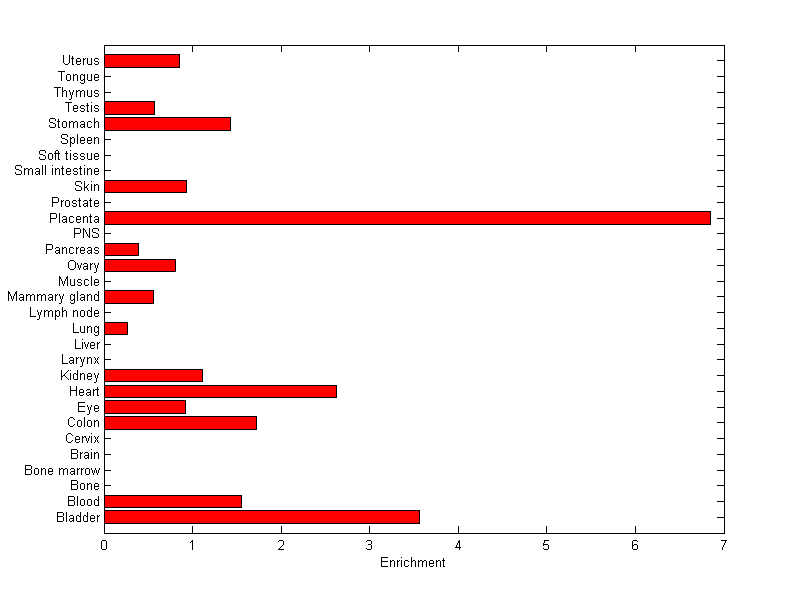 The expression level is normalized with tissue-library size. Each value for a gene in a tissue is a ratio of observed ESTs to the expected one in this tissue. The expected number of ESTs is the product of total ESTs of the gene and the fraction of total ESTs in the tissue among all ESTs in 30 tissues.