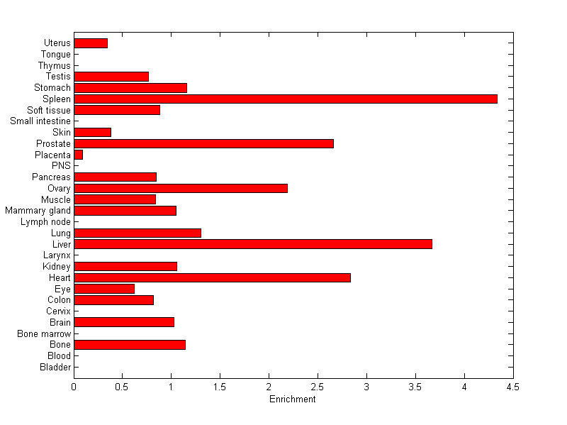 The expression level is normalized with tissue-library size. Each value for a gene in a tissue is a ratio of observed ESTs to the expected one in this tissue. The expected number of ESTs is the product of total ESTs of the gene and the fraction of total ESTs in the tissue among all ESTs in 30 tissues.