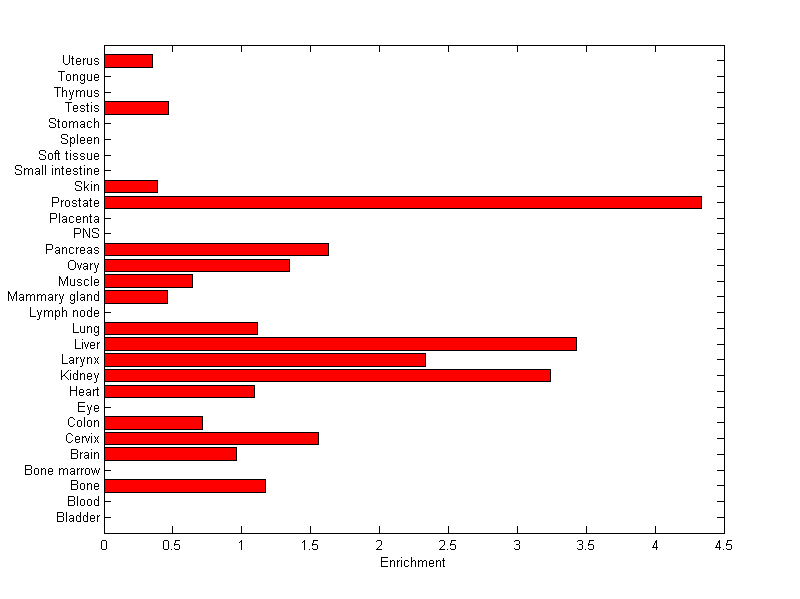 The expression level is normalized with tissue-library size. Each value for a gene in a tissue is a ratio of observed ESTs to the expected one in this tissue. The expected number of ESTs is the product of total ESTs of the gene and the fraction of total ESTs in the tissue among all ESTs in 30 tissues.