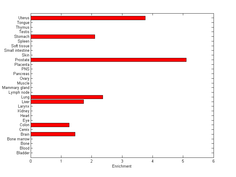 The expression level is normalized with tissue-library size. Each value for a gene in a tissue is a ratio of observed ESTs to the expected one in this tissue. The expected number of ESTs is the product of total ESTs of the gene and the fraction of total ESTs in the tissue among all ESTs in 30 tissues.