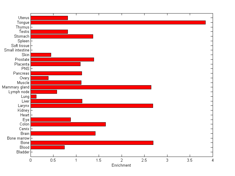 The expression level is normalized with tissue-library size. Each value for a gene in a tissue is a ratio of observed ESTs to the expected one in this tissue. The expected number of ESTs is the product of total ESTs of the gene and the fraction of total ESTs in the tissue among all ESTs in 30 tissues.