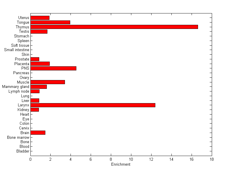 The expression level is normalized with tissue-library size. Each value for a gene in a tissue is a ratio of observed ESTs to the expected one in this tissue. The expected number of ESTs is the product of total ESTs of the gene and the fraction of total ESTs in the tissue among all ESTs in 30 tissues.