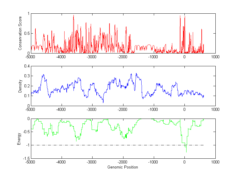 The energy profile (green curve) is about energy for module detection based on TF interaction. The positions with energy less than -1 indicate the existence of CRMs.