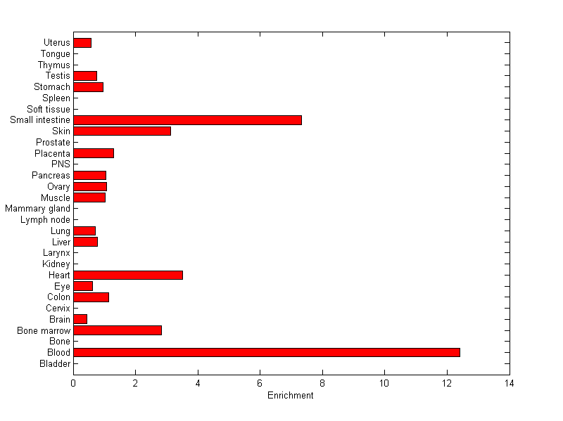 The expression level is normalized with tissue-library size. Each value for a gene in a tissue is a ratio of observed ESTs to the expected one in this tissue. The expected number of ESTs is the product of total ESTs of the gene and the fraction of total ESTs in the tissue among all ESTs in 30 tissues.