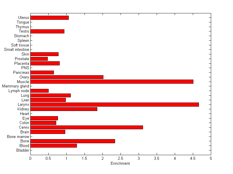 The expression level is normalized with tissue-library size. Each value for a gene in a tissue is a ratio of observed ESTs to the expected one in this tissue. The expected number of ESTs is the product of total ESTs of the gene and the fraction of total ESTs in the tissue among all ESTs in 30 tissues.