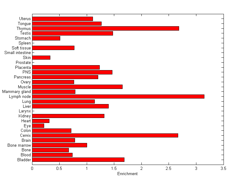 The expression level is normalized with tissue-library size. Each value for a gene in a tissue is a ratio of observed ESTs to the expected one in this tissue. The expected number of ESTs is the product of total ESTs of the gene and the fraction of total ESTs in the tissue among all ESTs in 30 tissues.