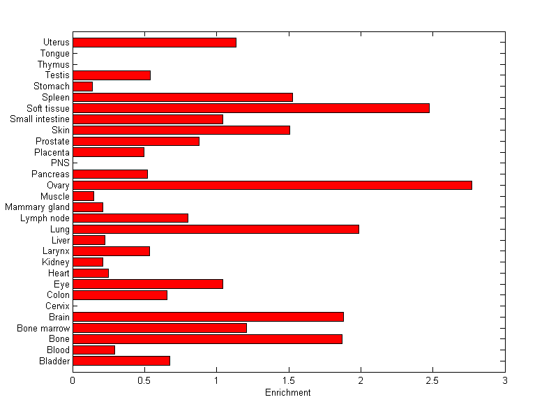 The expression level is normalized with tissue-library size. Each value for a gene in a tissue is a ratio of observed ESTs to the expected one in this tissue. The expected number of ESTs is the product of total ESTs of the gene and the fraction of total ESTs in the tissue among all ESTs in 30 tissues.