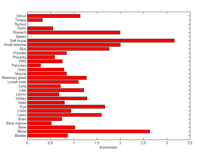 The expression level is normalized with tissue-library size. Each value for a gene in a tissue is a ratio of observed ESTs to the expected one in this tissue. The expected number of ESTs is the product of total ESTs of the gene and the fraction of total ESTs in the tissue among all ESTs in 30 tissues.