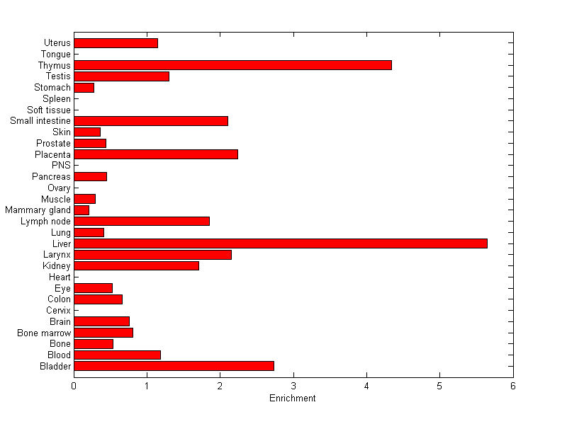 The expression level is normalized with tissue-library size. Each value for a gene in a tissue is a ratio of observed ESTs to the expected one in this tissue. The expected number of ESTs is the product of total ESTs of the gene and the fraction of total ESTs in the tissue among all ESTs in 30 tissues.