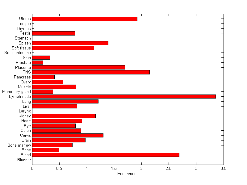The expression level is normalized with tissue-library size. Each value for a gene in a tissue is a ratio of observed ESTs to the expected one in this tissue. The expected number of ESTs is the product of total ESTs of the gene and the fraction of total ESTs in the tissue among all ESTs in 30 tissues.