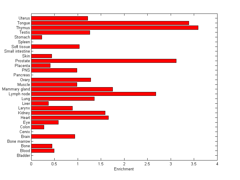 The expression level is normalized with tissue-library size. Each value for a gene in a tissue is a ratio of observed ESTs to the expected one in this tissue. The expected number of ESTs is the product of total ESTs of the gene and the fraction of total ESTs in the tissue among all ESTs in 30 tissues.