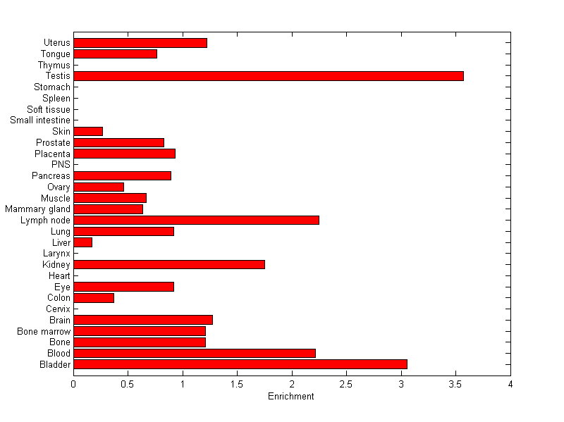 The expression level is normalized with tissue-library size. Each value for a gene in a tissue is a ratio of observed ESTs to the expected one in this tissue. The expected number of ESTs is the product of total ESTs of the gene and the fraction of total ESTs in the tissue among all ESTs in 30 tissues.