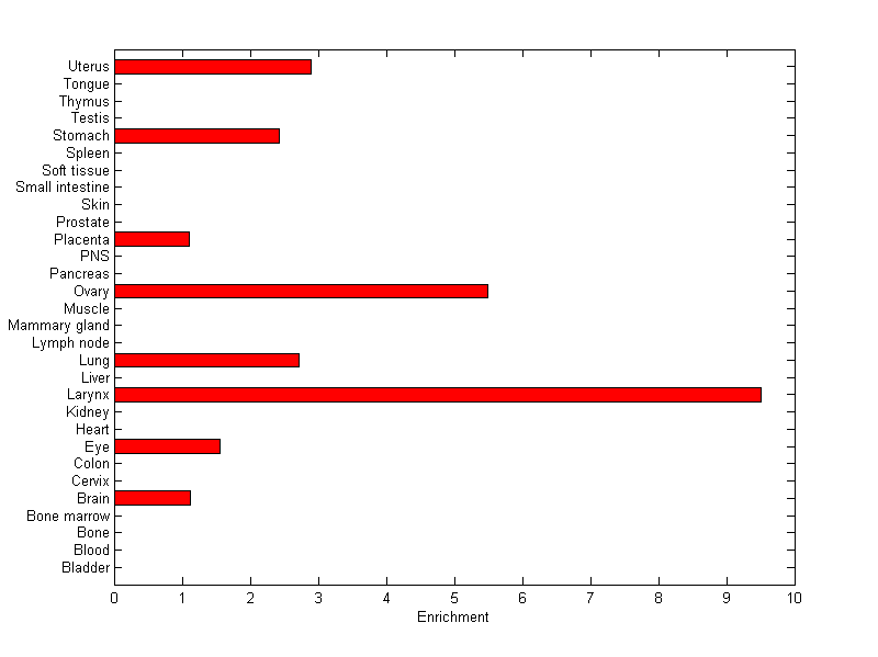 The expression level is normalized with tissue-library size. Each value for a gene in a tissue is a ratio of observed ESTs to the expected one in this tissue. The expected number of ESTs is the product of total ESTs of the gene and the fraction of total ESTs in the tissue among all ESTs in 30 tissues.
