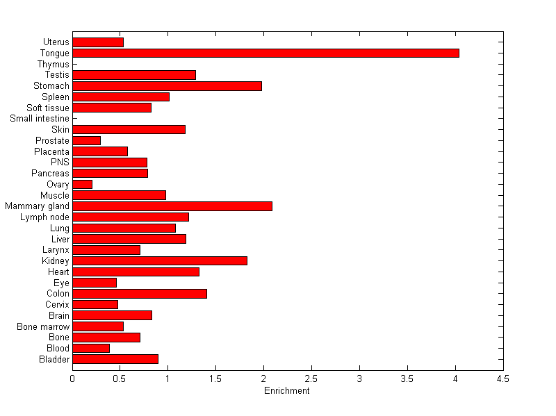 The expression level is normalized with tissue-library size. Each value for a gene in a tissue is a ratio of observed ESTs to the expected one in this tissue. The expected number of ESTs is the product of total ESTs of the gene and the fraction of total ESTs in the tissue among all ESTs in 30 tissues.