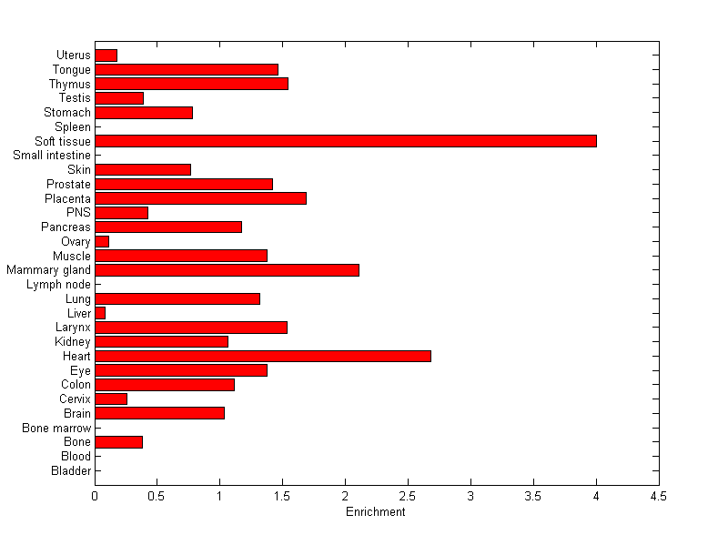 The expression level is normalized with tissue-library size. Each value for a gene in a tissue is a ratio of observed ESTs to the expected one in this tissue. The expected number of ESTs is the product of total ESTs of the gene and the fraction of total ESTs in the tissue among all ESTs in 30 tissues.