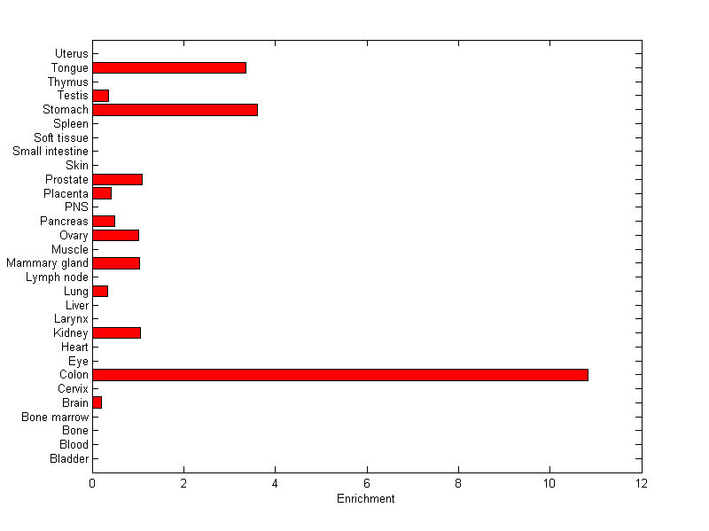 The expression level is normalized with tissue-library size. Each value for a gene in a tissue is a ratio of observed ESTs to the expected one in this tissue. The expected number of ESTs is the product of total ESTs of the gene and the fraction of total ESTs in the tissue among all ESTs in 30 tissues.