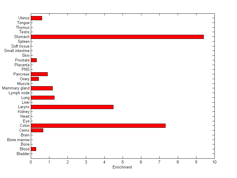 About the profile: The expression level is normalized with tissue-library size. Each value for a gene in a tissue is a ratio of observed ESTs to the expected one in this tissue. The expected number of ESTs is the product of total ESTs of the gene and the fraction of total ESTs in the tissue among all ESTs in 30 tissues. Summary: This gene is preferentially expressed in [colon, stomach] Download: |