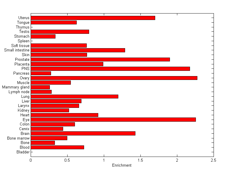 The expression level is normalized with tissue-library size. Each value for a gene in a tissue is a ratio of observed ESTs to the expected one in this tissue. The expected number of ESTs is the product of total ESTs of the gene and the fraction of total ESTs in the tissue among all ESTs in 30 tissues.