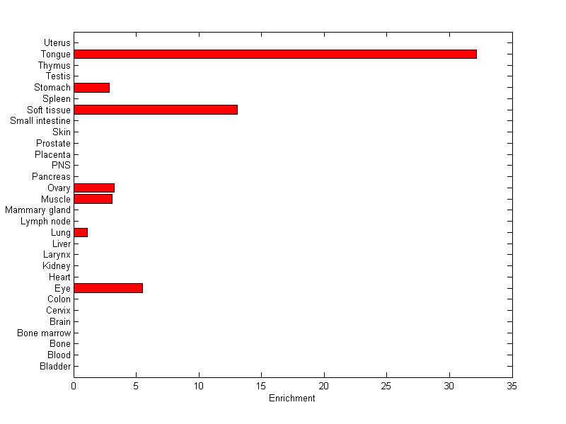 The expression level is normalized with tissue-library size. Each value for a gene in a tissue is a ratio of observed ESTs to the expected one in this tissue. The expected number of ESTs is the product of total ESTs of the gene and the fraction of total ESTs in the tissue among all ESTs in 30 tissues.