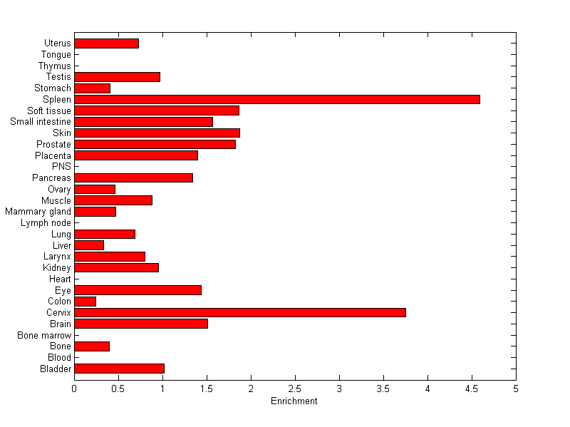The expression level is normalized with tissue-library size. Each value for a gene in a tissue is a ratio of observed ESTs to the expected one in this tissue. The expected number of ESTs is the product of total ESTs of the gene and the fraction of total ESTs in the tissue among all ESTs in 30 tissues.