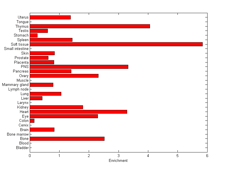 The expression level is normalized with tissue-library size. Each value for a gene in a tissue is a ratio of observed ESTs to the expected one in this tissue. The expected number of ESTs is the product of total ESTs of the gene and the fraction of total ESTs in the tissue among all ESTs in 30 tissues.