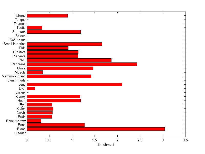 The expression level is normalized with tissue-library size. Each value for a gene in a tissue is a ratio of observed ESTs to the expected one in this tissue. The expected number of ESTs is the product of total ESTs of the gene and the fraction of total ESTs in the tissue among all ESTs in 30 tissues.