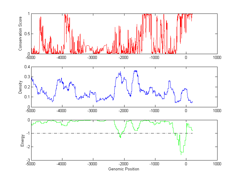 About the profiles: The conservation profile (red curve) is about conservation scores of the promoter sequences. Conservation was determined from an eight-way alignment of human, chimpanzee, dog, mouse, rat, chicken, zebrafish and fugu sequences. The conservation was quantified by a conservation score between 0 and 1, with 1 as highest conservation. The conservation score was obtained from UCSC genome databases. The density profile (blue curve) is about density of all TF binding sites. The energy profile (green curve) is about energy for module detection based on TF interaction. The positions with energy less than -1 indicate the existence of CRMs. Download: Conservation profileDensity profile Energy profile CRM summary |