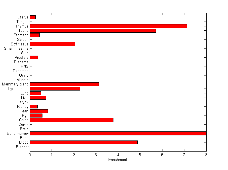 About the profile: The expression level is normalized with tissue-library size. Each value for a gene in a tissue is a ratio of observed ESTs to the expected one in this tissue. The expected number of ESTs is the product of total ESTs of the gene and the fraction of total ESTs in the tissue among all ESTs in 30 tissues. Summary: This gene is preferentially expressed in [bone_marrow, testis] Download: |