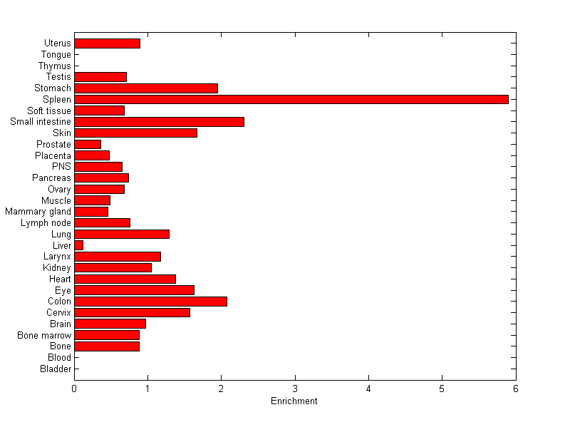 The expression level is normalized with tissue-library size. Each value for a gene in a tissue is a ratio of observed ESTs to the expected one in this tissue. The expected number of ESTs is the product of total ESTs of the gene and the fraction of total ESTs in the tissue among all ESTs in 30 tissues.