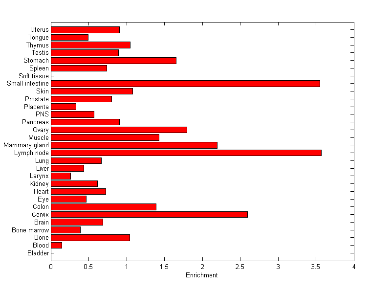 The expression level is normalized with tissue-library size. Each value for a gene in a tissue is a ratio of observed ESTs to the expected one in this tissue. The expected number of ESTs is the product of total ESTs of the gene and the fraction of total ESTs in the tissue among all ESTs in 30 tissues.