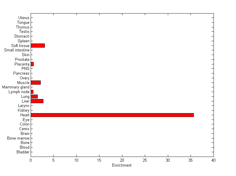 The expression level is normalized with tissue-library size. Each value for a gene in a tissue is a ratio of observed ESTs to the expected one in this tissue. The expected number of ESTs is the product of total ESTs of the gene and the fraction of total ESTs in the tissue among all ESTs in 30 tissues.