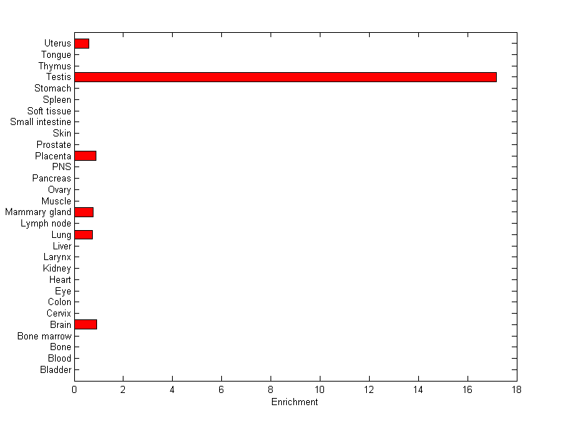 The expression level is normalized with tissue-library size. Each value for a gene in a tissue is a ratio of observed ESTs to the expected one in this tissue. The expected number of ESTs is the product of total ESTs of the gene and the fraction of total ESTs in the tissue among all ESTs in 30 tissues.