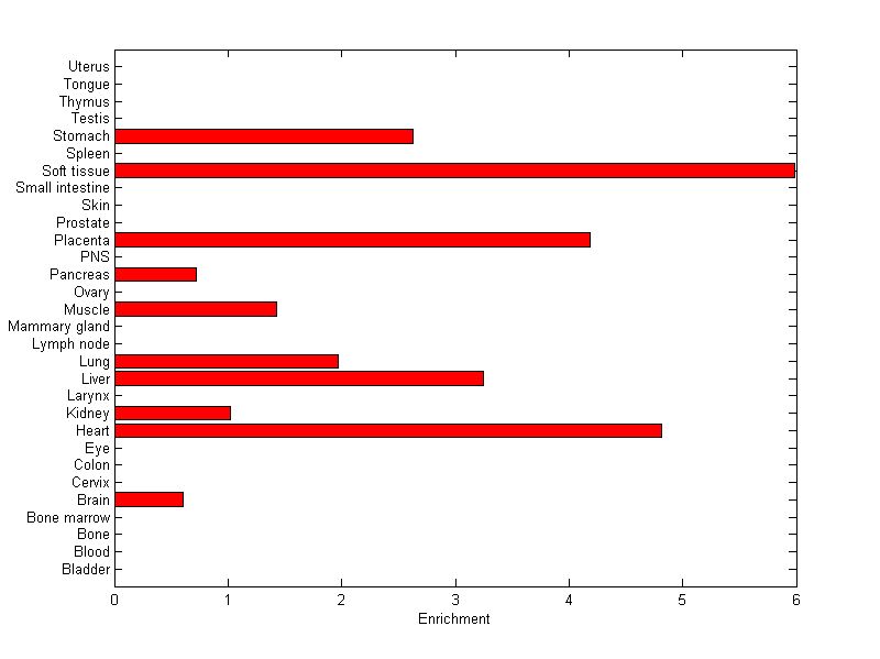The expression level is normalized with tissue-library size. Each value for a gene in a tissue is a ratio of observed ESTs to the expected one in this tissue. The expected number of ESTs is the product of total ESTs of the gene and the fraction of total ESTs in the tissue among all ESTs in 30 tissues.