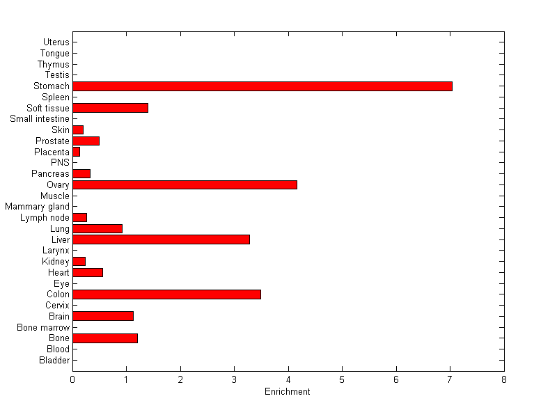 The expression level is normalized with tissue-library size. Each value for a gene in a tissue is a ratio of observed ESTs to the expected one in this tissue. The expected number of ESTs is the product of total ESTs of the gene and the fraction of total ESTs in the tissue among all ESTs in 30 tissues.