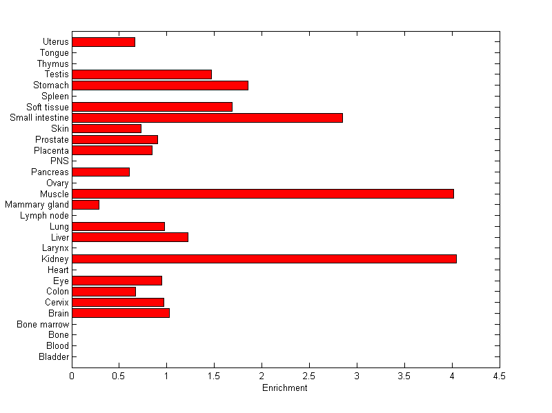 The expression level is normalized with tissue-library size. Each value for a gene in a tissue is a ratio of observed ESTs to the expected one in this tissue. The expected number of ESTs is the product of total ESTs of the gene and the fraction of total ESTs in the tissue among all ESTs in 30 tissues.