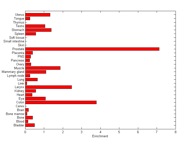 The expression level is normalized with tissue-library size. Each value for a gene in a tissue is a ratio of observed ESTs to the expected one in this tissue. The expected number of ESTs is the product of total ESTs of the gene and the fraction of total ESTs in the tissue among all ESTs in 30 tissues.
