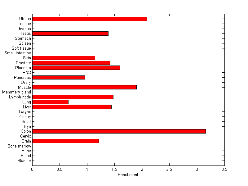 The expression level is normalized with tissue-library size. Each value for a gene in a tissue is a ratio of observed ESTs to the expected one in this tissue. The expected number of ESTs is the product of total ESTs of the gene and the fraction of total ESTs in the tissue among all ESTs in 30 tissues.