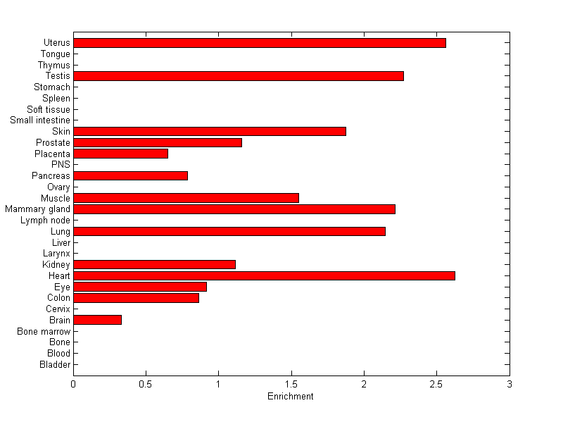 The expression level is normalized with tissue-library size. Each value for a gene in a tissue is a ratio of observed ESTs to the expected one in this tissue. The expected number of ESTs is the product of total ESTs of the gene and the fraction of total ESTs in the tissue among all ESTs in 30 tissues.