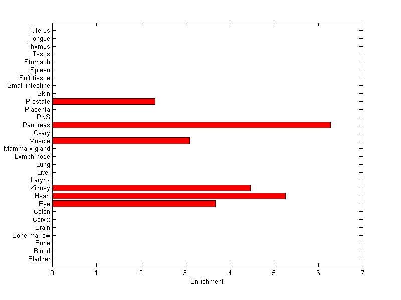 The expression level is normalized with tissue-library size. Each value for a gene in a tissue is a ratio of observed ESTs to the expected one in this tissue. The expected number of ESTs is the product of total ESTs of the gene and the fraction of total ESTs in the tissue among all ESTs in 30 tissues.