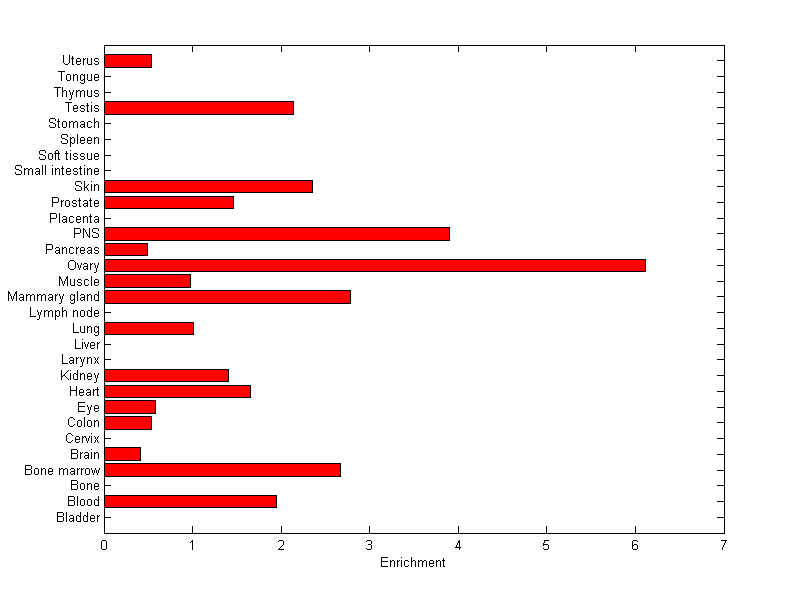 The expression level is normalized with tissue-library size. Each value for a gene in a tissue is a ratio of observed ESTs to the expected one in this tissue. The expected number of ESTs is the product of total ESTs of the gene and the fraction of total ESTs in the tissue among all ESTs in 30 tissues.