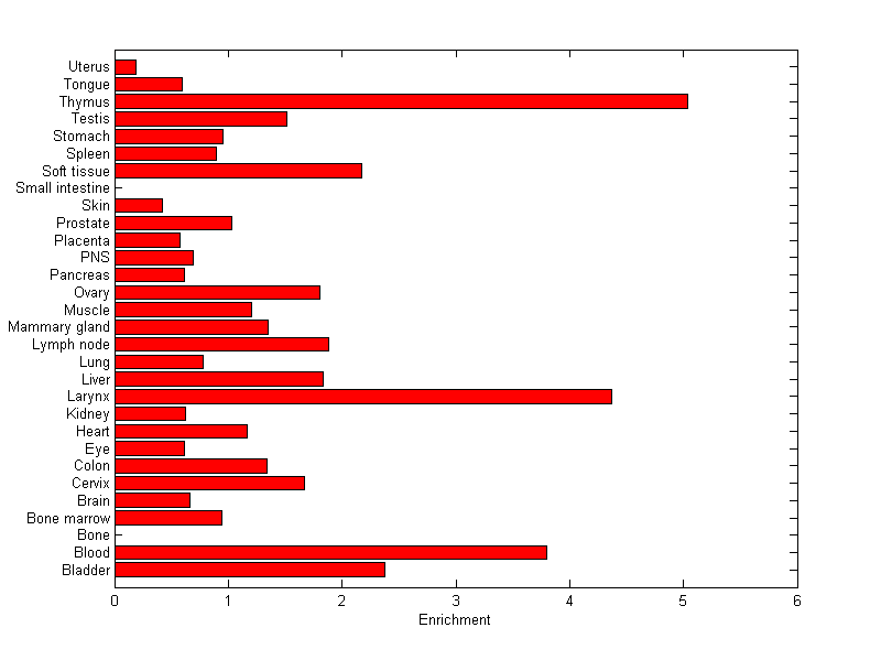 The expression level is normalized with tissue-library size. Each value for a gene in a tissue is a ratio of observed ESTs to the expected one in this tissue. The expected number of ESTs is the product of total ESTs of the gene and the fraction of total ESTs in the tissue among all ESTs in 30 tissues.