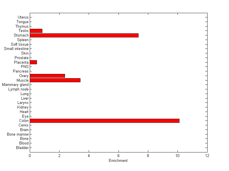 The expression level is normalized with tissue-library size. Each value for a gene in a tissue is a ratio of observed ESTs to the expected one in this tissue. The expected number of ESTs is the product of total ESTs of the gene and the fraction of total ESTs in the tissue among all ESTs in 30 tissues.