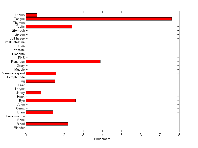The expression level is normalized with tissue-library size. Each value for a gene in a tissue is a ratio of observed ESTs to the expected one in this tissue. The expected number of ESTs is the product of total ESTs of the gene and the fraction of total ESTs in the tissue among all ESTs in 30 tissues.